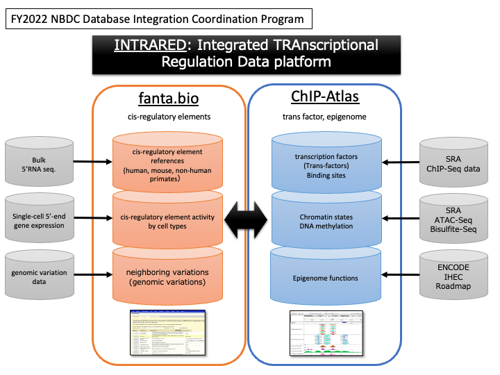 INTRARED is a data platform for promoting the understanding of the transcriptional regulations. The platform integrates the data of cis-regulatory elements (CRE), trans-factors, and epigenomes. The data platform consists of two databases. fanta.bio is a database of CREs, which are genomic regions contributing to the regulation of gene and transcript expressions in the same chromosomes, with their locations and activities in various cell types and states. ChIP-Atlas is a database of trans-factors that bind to CREs and epigenomes that affects to CREs and trans-factors. In the data platform, developing and operating teams in both databases cooperate and build datasets of transcriptional regulations and develop interfaces to provide them.